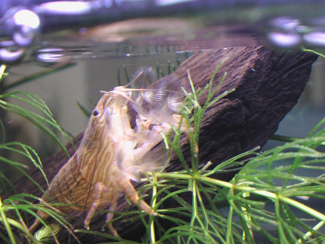 で、去年の11月頃から我が家の流木ストック水槽にはこんなえびも↓