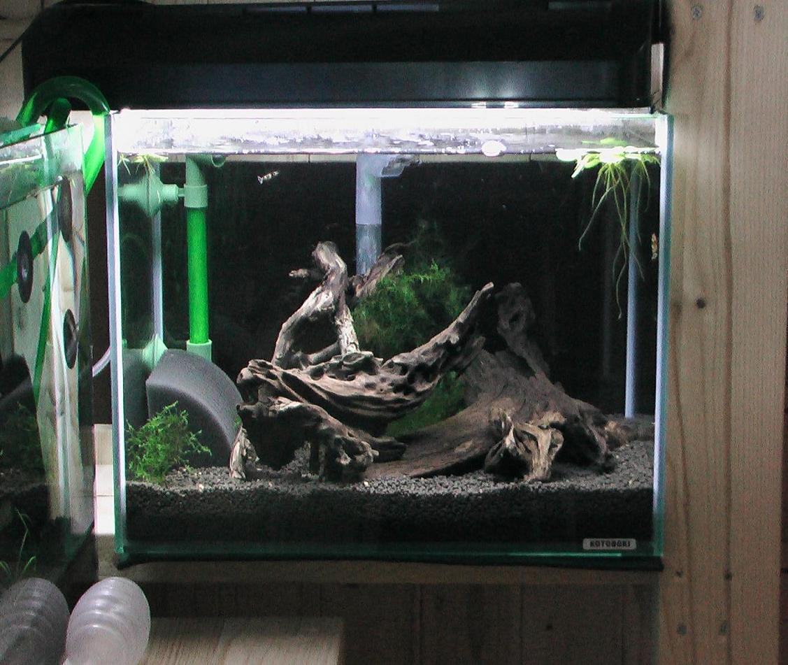 ヒドラ退治にグラミーを購入、早速日曜に問題の90スリムへ入れました。 二匹購入♪ さてさて・・、どうなるかな・・ と様子を見てましたが。 これは予想以上の生物兵器で御座いました(^o^)ノ 一晩で目視確認できてたヒドラが全く見えずwわざと残しておいた数匹のヒドラもいた場所にいないですww 良い仕事しますな!! 二匹で流木や草やソイルの上をまんべんなく旋回して何かを食べてます。きっとミジンコも食べてますよねw パールやサンセットは以前に飼ってましたがハニーは初めてです。なかなか、小回りの利く動きに好感です。 えびも移動してあるので、きもーち多めの換水でちょっと貧栄養状態にしたいところ。うん、一石二鳥ww えび移動先の小型水槽。 レイアウトも・・何も・・ありません^^; 入れたい水草は全て90スリム(グラミーでヒドラ除去中)なのでもうちょい我慢。 新しく休みの日に水草かおうかと思いましたが、何だか良いのがないのでヒドラ除去を確認してから、シダを移動させます。稚えび産まれるまで・・、あと2週間ないかな(^o^)ノ 左、小型水槽でお過ごしのえびも更に抱卵固体が出てきました! あれだけ「抱卵しない症候群」だったのに・・。 不思議だー。 PR |